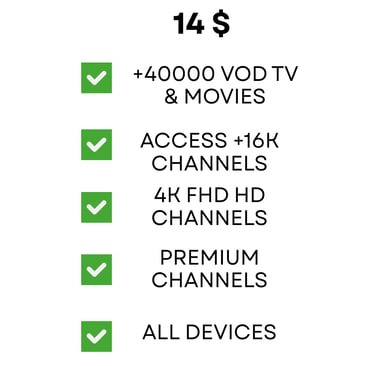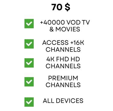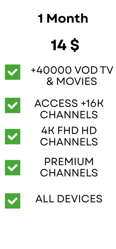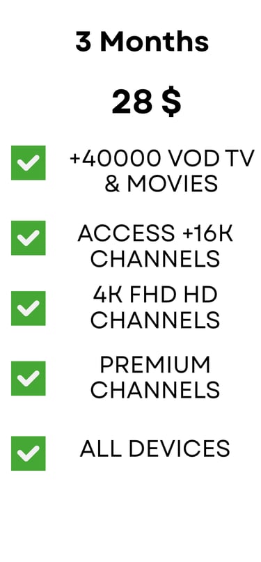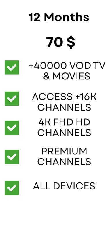 Affordable pricing plans with no hidden fees or long-term commitments. Choose from a variety of options to access our extensive channel lineup and high-quality streaming capabilities. Sign up today and start enjoying the ultimate IPTV experience at unbeatable value.